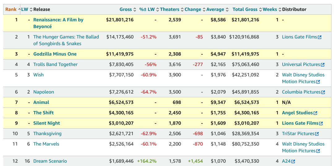 此外,AMC影院发行也遵循《泰勒·斯威夫特:时代巡回演唱会》的非常规策略,让《碧昂丝》在部分工作日暂时退出大银幕,由此《哥斯拉-1.0》在周一时还攀升至头名,以微弱优势压过《饥饿游戏:鸣鸟与游蛇之歌》。