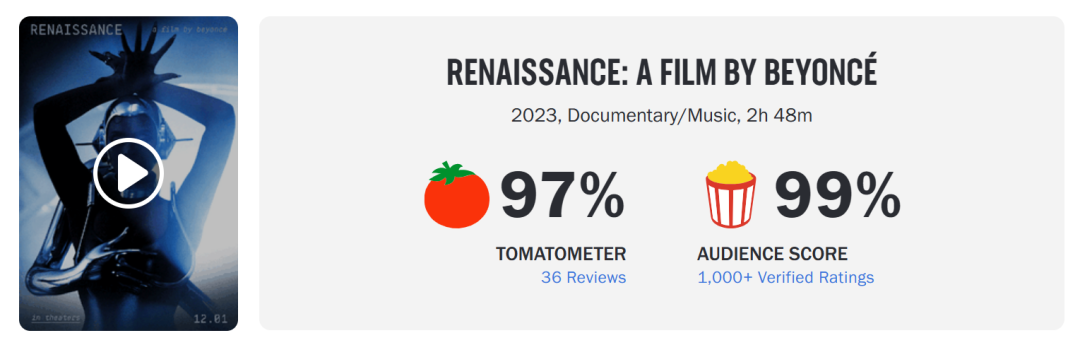 在北美,《碧昂丝:文艺复兴》(以下简称《碧昂丝》)首映便冲破2千万美元,改写近20年来的同期票房新高,并赢得媒体和观众的一致好评;再加上《泰勒·斯威夫特:时代巡回演唱会》,秋冬档的演唱会电影/音乐纪录片连出爆款,让影市得以维持在高位上运转,将为更多同类型项目开拓大银幕之路。