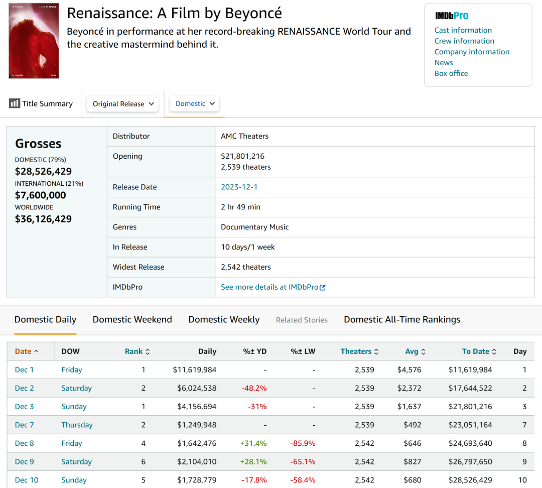 据The-Numbers统计,《碧昂丝》在提前场便进账506万美元,超过《泰勒·斯威夫特:时代巡回演唱会》(280万美元)。随后《碧昂丝》铺开至北美2539家影院,首日以1162万美元无悬念登顶;接下来《碧昂丝》分别下滑48%和31%,首周末报收于2180万美元,单馆收益为8587美元。