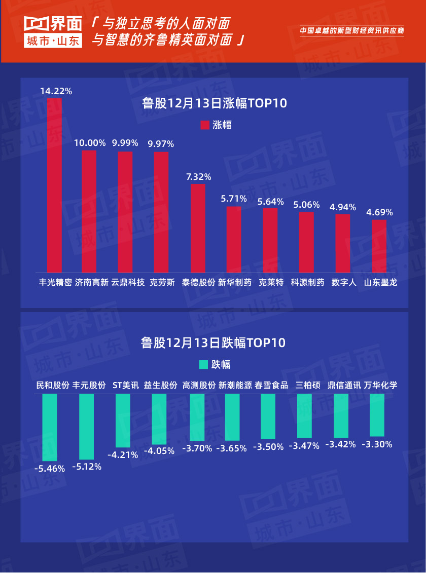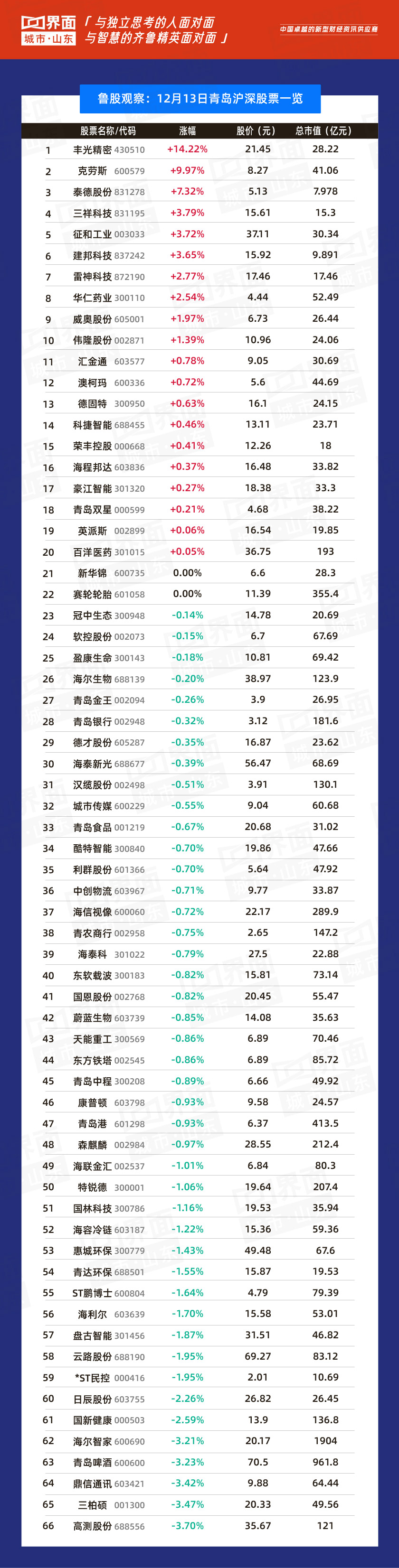 青岛市涨幅榜首:丰光精密(430510),涨幅14.22%,股价21.45元,总市值28.22亿元;