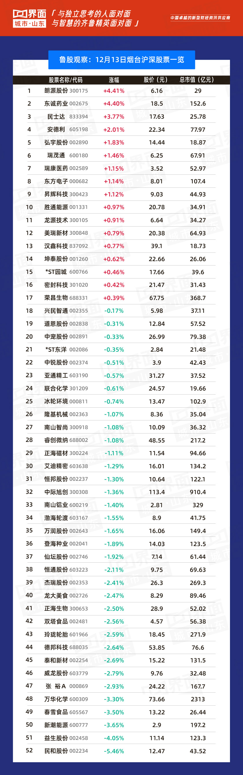 烟台市涨幅榜首:朗源股份(300175),涨幅4.41%,股价6.16元,总市值29.00亿元;
