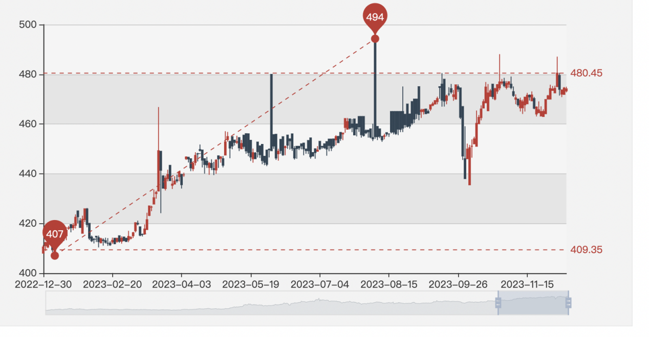 2018年上海黄金交易所AU9999合约全年平均价为271.44元/克,2023年上半年上海黄金交易所AU9999合约全年平均价432.09元/克,涨幅为59.18%。2023年1月至12月8日,AU9999的最高收盘价未超过480.45元/克,若按照最高收盘价计算的涨幅为77.00%,这意味着,2018年至2020年间老铺黄金1g产品价格涨幅已经远远超过了金价涨幅。