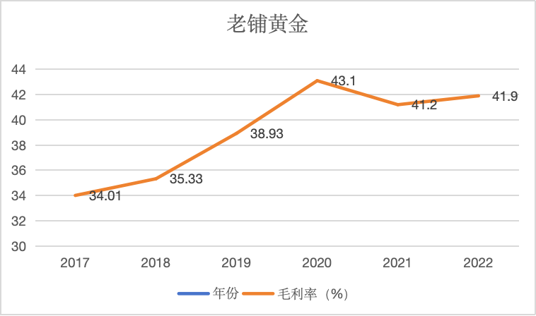 上述黄金珠宝领域上市公司中,毛利率最高的系周六福,但周六福的毛利率仍低于老铺黄金。据招股书披露,2020年至2023年上半年,老铺黄金的毛利率分别为43.1%、41.2%、41.9%和41.7%,平均毛利率水平维持在41%以上。