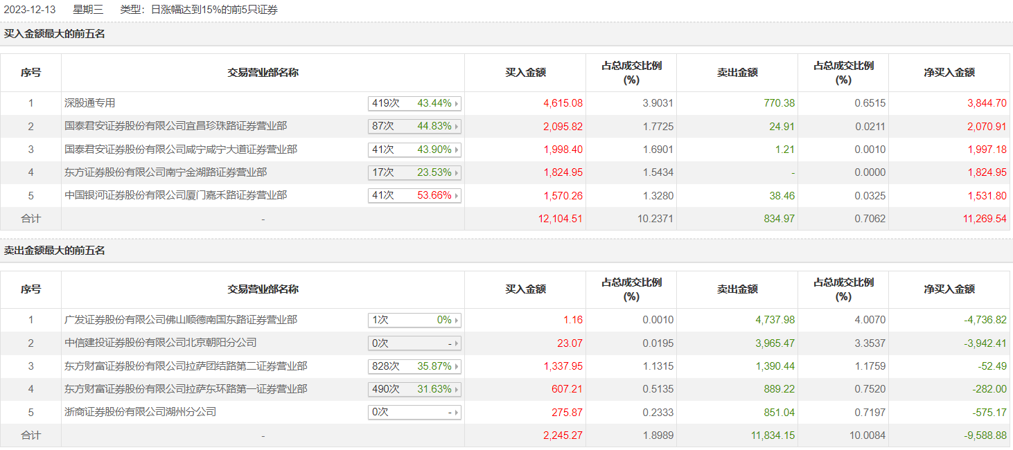 拓新药业12月13日涨19.98%,全天换手率达25.28%,振幅达18.63%。龙虎榜数据显示,营业部席位合计净买入1680.65万元。其中,深股通专用、国泰君安证券宜昌珍珠路证券营业部分别买入4615.08万元、2095.82万元;广发证券佛山顺德南国东路证券营业部、中信建投证券北京朝阳分公司分别卖出4737.98万元、3965.47万元。