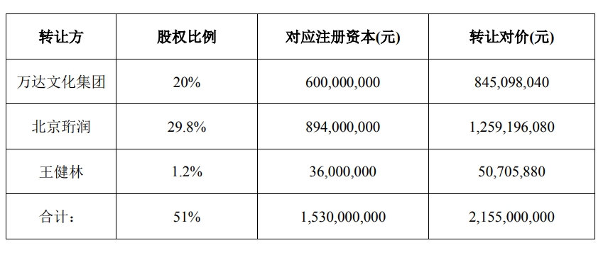 12月12日,万达文化集团、北京珩润及王健林先生与儒意投资签署《股权转让协议》,拟分别将其持有的万达投资20%、29.8%和1.2%股权(合计持有万达投资51%股权)转让予儒意投资,转让价款共计人民币21.55亿元。
