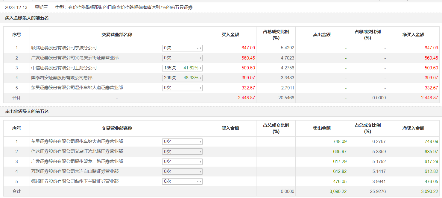 雪龙集团12月13日跌停,全天换手率达2.37%,振幅达13.28%。龙虎榜数据显示,营业部席位合计净卖出641.34万元。其中,东吴证券温州车站大道证券营业部、信达证券义乌江滨北路证券营业部分别卖出748.09万元、635.97万元;联储证券宁波分公司、广发证券义乌庆云街证券营业部分别买入647.09万元、560.45万元。