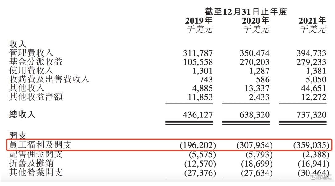 根据招股书,太盟投资在全球设立12个主要办事处,雇佣近600名员工,包括293名投资专业人员、68名投资支持专业人员等。2021年,太盟投资的员工福利及开支约3.59亿美元,人均收入高达59.8万美元,折合人民币约380万元。