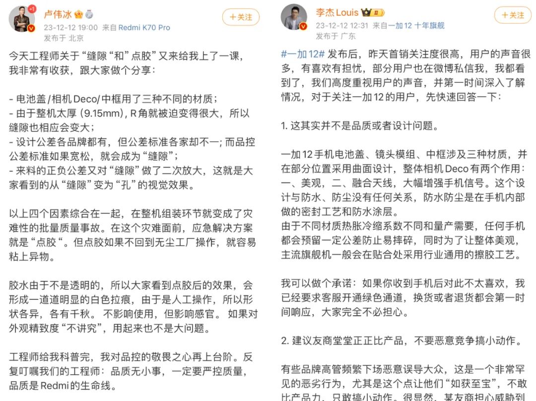 这也引来了小米集团合伙人卢伟冰的关注。卢伟冰在微博上,对近期新机“缝隙”“点胶”事故请专业员工作出专业分析和事故成因,引发部分网友晒图,多为一加12机型。
