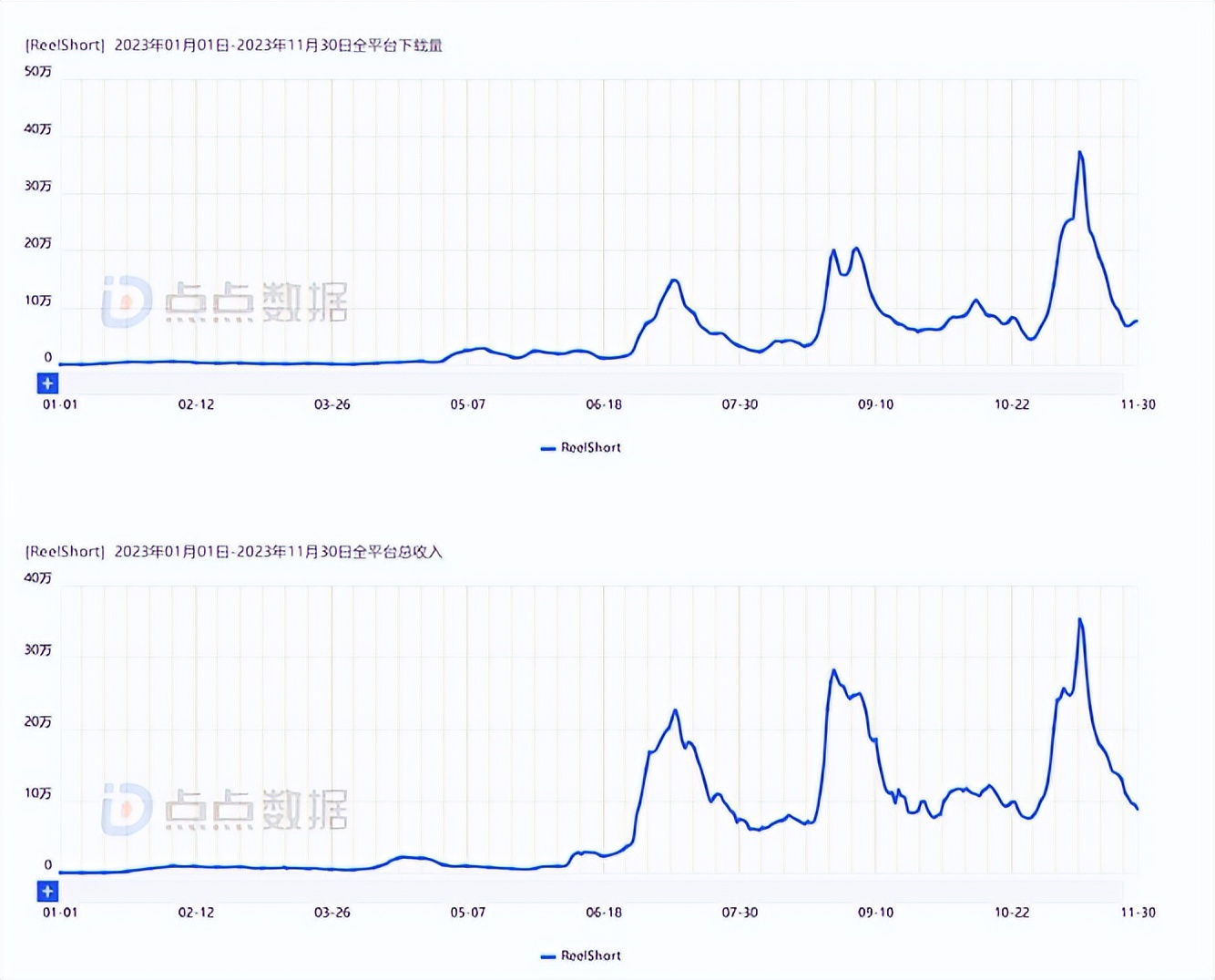 ReelShort从六月起开始了较大规模的投放,从下载数据和收入数据看,收入曲线基本上和下载曲线一致。经常投资游戏股的朋友们应该会有所感悟,这种曲线一般情况下是买量类游戏爬坡期的逻辑,高下载高流水,同时流水和下载高度同频。换句话说,高流水是高买量换回来的。