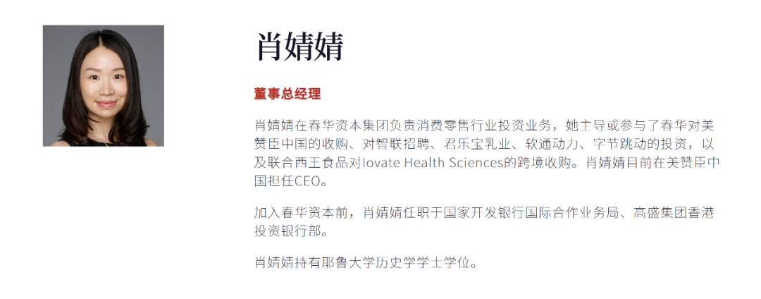从以往履历来看,肖婧婧不仅主导了春华资本对美赞臣中国的收购,还参与了对智联招聘、君乐宝乳业、软通动力、字节跳动的投资,以及联合西王食品对Iovate Health Sciences的跨境收购。