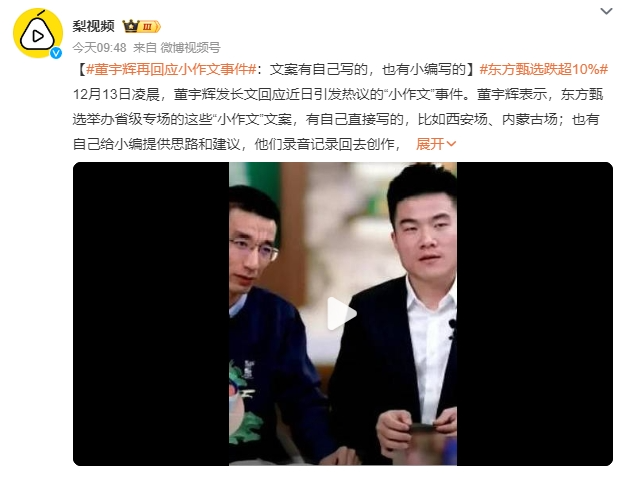 13日凌晨,董宇辉发长文回应灭火“小作文”事件。他表示,东方甄选举办省级专场的这些“小作文”文案,有自己直接写的,比如西安场、内蒙古场;也有自己给小编提供思路和建议。