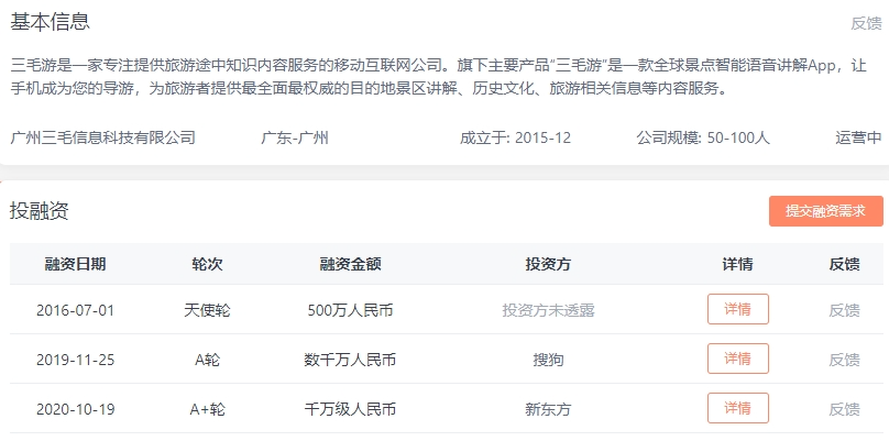 目前主力产品的供应商“三毛游”,曾在2020年获得新东方千万级的A+轮融资,可见俞敏洪布局之早。据“趣解商业”了解,其他OTA平台上线的“三毛游”博物馆导览服务中,导游也会主动讲自己是新东方被投企业,特别强调自己以文化、知识内容见长。
