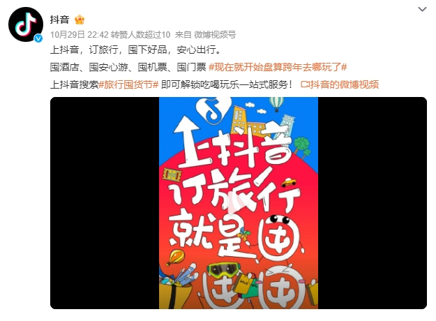 今年10月,抖音生活服务酒旅行业推出“旅行囤货节”,邀请金星、刘畊宏&王婉霏Vivi、钟丽缇等多位明星达人开启专场直播;活动期间,吸引近450万用户参与,抖音平台上关于“旅行囤货节”的相关内容话题浏览量超4亿,助力酒旅行业商家提升了线上声量与销售转化。