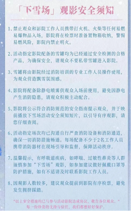 新的考验也出现了,其中之一便是消防隐患。有影院人士表示,“观众进场要查打火机,影城群里已经在互相提醒了,希望千万不要出任何事故。”“不出事还好,出事的话下雪场票价在很多地方也不便宜,最后搞得两败俱伤。”其他的担忧还有是否会影响下一场放映。这场风波或许能够为后来者带来启示:创意宣发虽好,但唯有妥善地组织才能保证善始善终,院线与片方双赢。