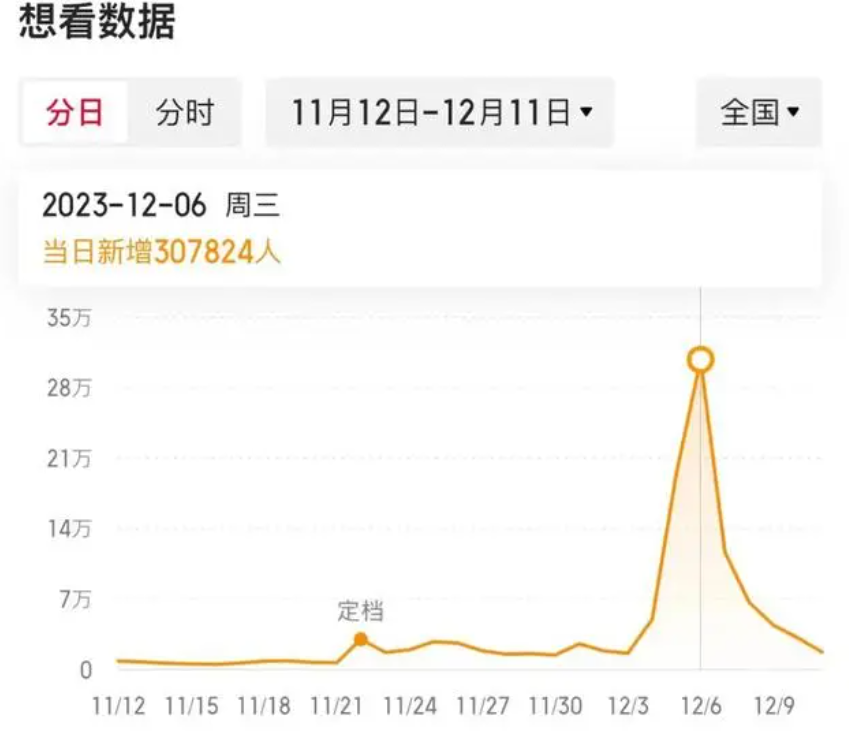 其猫眼想看人数随着小红书、抖音、微博各大平台话题热度而飙升,在12月5日突然迎来爆发,新增19.6万,12月6日单想看人数新增31.09万,上映前23天,预售票房突破1亿元,成为映前预售最早破亿电影和贺岁档预售最快破亿电影。