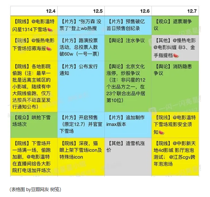 一时间网上众说纷纭,有人质疑“注水”,而其真实原因或许在于组织流程上的混乱。在豆瓣《亮星星》官方小组帖子中,梳理了整个事件的过程:12月4日,很多影院在得到消息后抢跑(尤其是偏远院线),在没有拿到官方授权情况下12.30同一时间排片,粉丝在不知情情况下纷纷抢票,或之后押宝式购票,因此片方选择提前两天12.5开预售,非官方指定的1314家、下雪道具影院自备,此后甚至造成造雪机断货涨价;