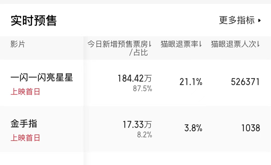 截至发稿前,猫眼专业版显示《亮星星》退票率高达21.1%,退票人数高达52万人+。
