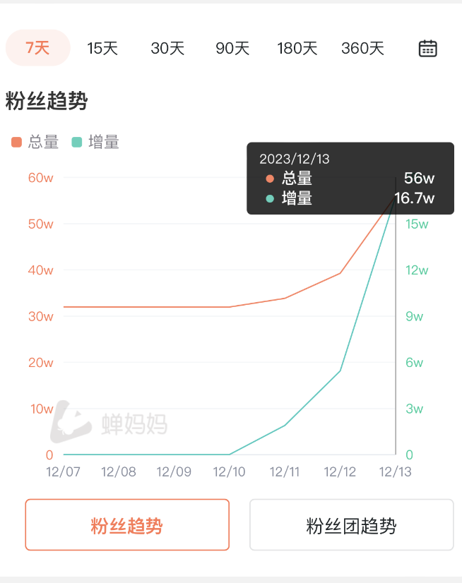 此前,高途佳品的粉丝长期处于32万人。直到12月11日人数开始拉升,并于13日迎来爆发。截至发稿,该直播间粉丝数涨至59万人。