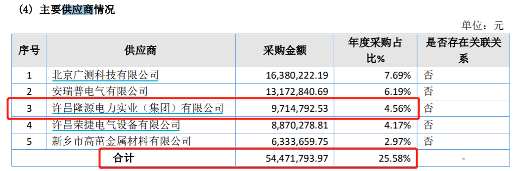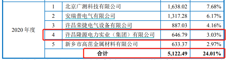 招股书显示,2020年,许昌智能向前五大供应商的采购总额5122.49万元,采购占比24.01%。其中,公司向许昌隆源电力实业(集团)有限公司(以下简称“隆源电力”)的采购金额为646.79万元,占比3.03%。同时,隆源电力也是许昌智能2020年的第四大供应商。