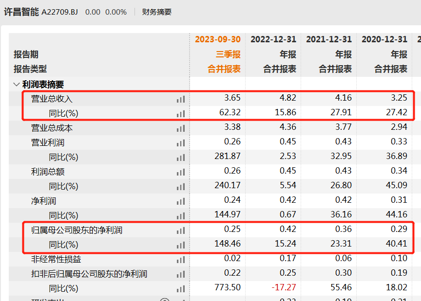 2020年-2023年前三季度,许昌智能的营业收入分别为3.25亿元、4.16亿元、4.82亿元和3.65亿元,同期归母净利润分别为2947.64万元、3634.71万元、4188.54万元和2481.15万元。