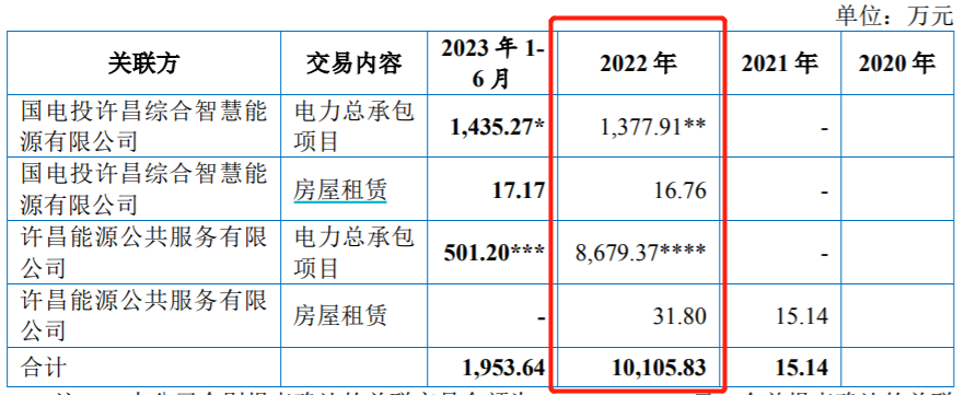 2022年,许昌能源向许昌智能采购110KV玉兰变电站及其相关配套设施的电力施工服务,国电投许昌向公司采购户用光伏相关的施工总承包业务,关联交易金额共计1.01亿元,2023年上半年关联交易金额为1953.64万元,关联交易大幅增加。