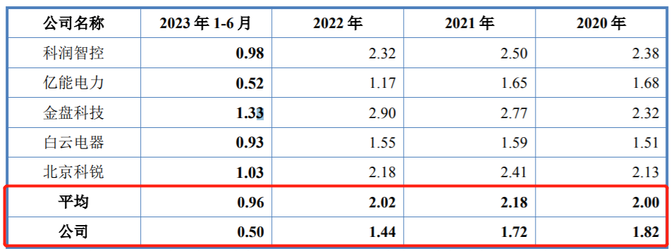 同期,公司应收账款周转率分别为1.82、1.72、1.44和0.50,低于同行业可比公司均值的2.00、2.18、2.02和0.96。