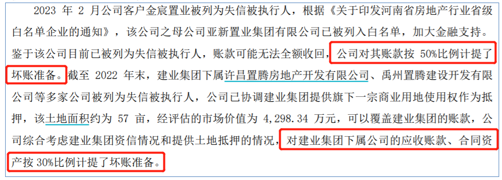 值得注意的是,建业集团下属多家公司已被列为失信被执行人,许昌智能按30%比例计提坏账准备。而2023年2月,金宸置业同样被列为失信被执行人,许昌智能却按50%比例计提了坏账准备,为何会出现这样的差异?