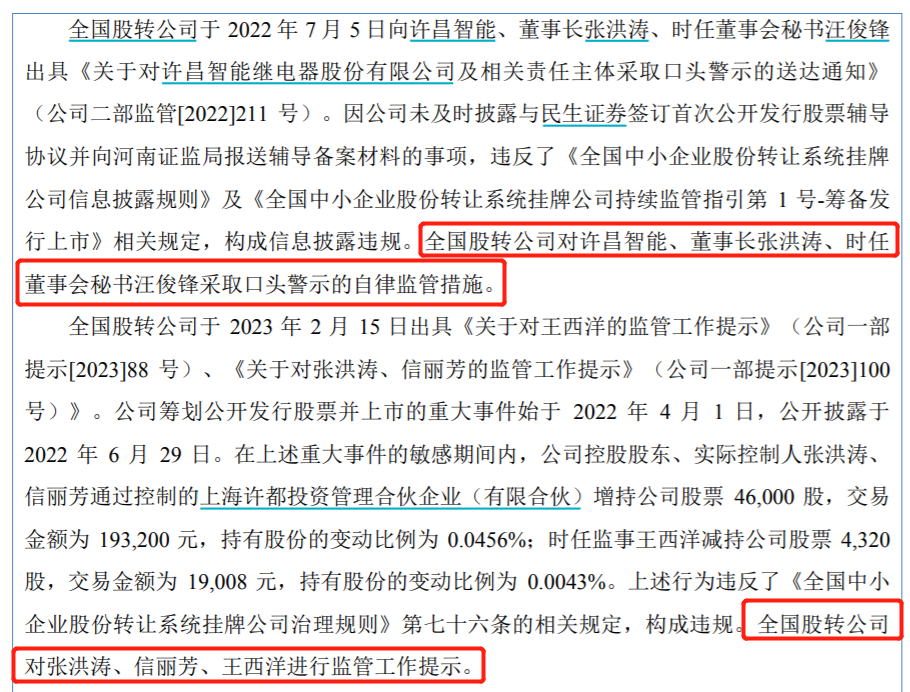 由于在上市敏感期内增持减持,2023年2月15日,全国股转公司出具对许昌智能控股股东、实际控制人张洪涛、信丽芳以及监事王西洋的监管工作提示。