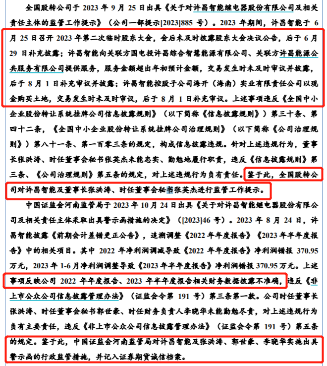 9月25日,因未及时披露股东大会决议公告、未及时审议并披露关联服务金额以及未及时审议控股子公司购买土地交易的信息披露违规,全国股转系统对许昌智能及董事长、董事会秘书进行监管工作提示。