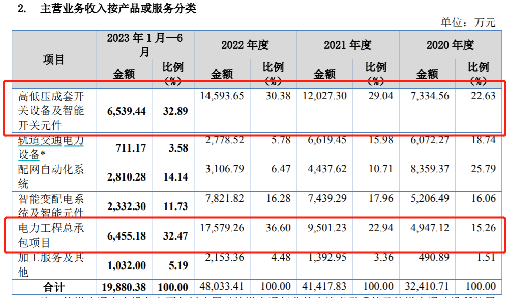 其中,2020年-2023年1-6月(以下简称“报告期”),公司高低压成套开关设备及智能开关元件销售金额分别为7334.56万元、1.2亿元、1.46亿元和6539.44万元,占主营业务收入比例分别为22.63%、29.04%、30.38%和32.89%,占比较高。