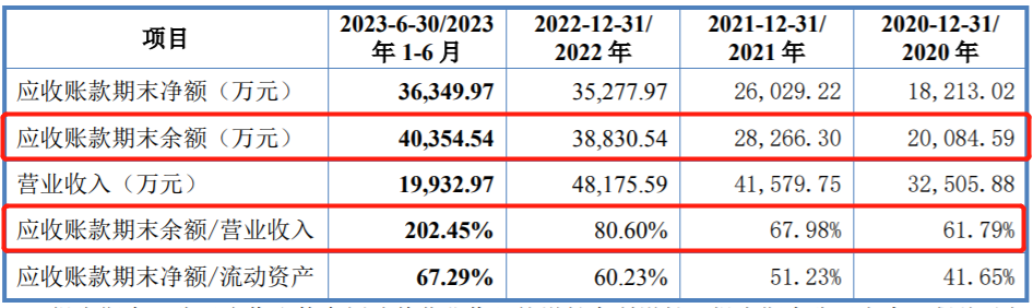 招股书披露,报告期各期末,许昌智能的应收账款期末余额分别为2.01亿元、2.83亿元、3.88亿元和4.04亿元,占营业收入的比例分别为61.79%、67.98%、80.60%和202.45%,占比逐年增加。