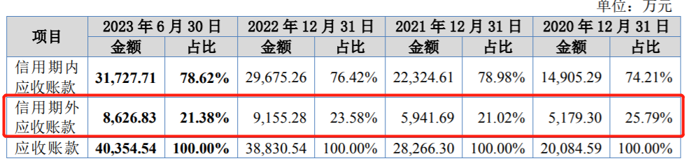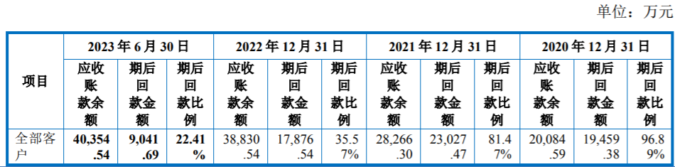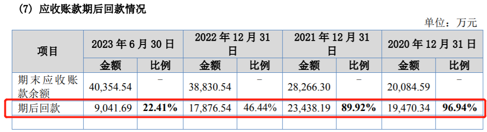 其中,报告期内,公司信用期外应收账款占应收账款余额比例分别为25.79%、21.02%、23.58%和21.38%;期后回款比例分别为96.94%、89.92%、46.44%和22.41%。