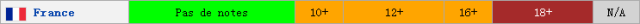共分为五个等级:一级为大众皆宜的程度;二级为10岁以下儿童不宜;三级为12岁以下儿童不宜;四级为16岁以下青少年不宜;五级为18岁以下青少年不宜。此外,法国还设置了家庭共赏时间,在22:30之前不得播放带有色情或者暴力内容的节目。