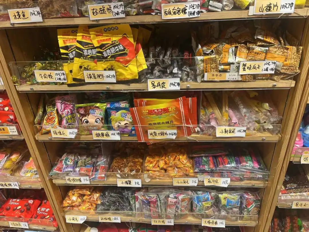 在北京著名打卡地标—簋街,默默偶然走进了这家小店,左右两排货架上,密密麻麻摆满了充满童年回忆的小零食。“真没想到还能看到麦丽素、小螃蟹、流口水、大喔喔糖这些零食。”默默向店主感慨道。