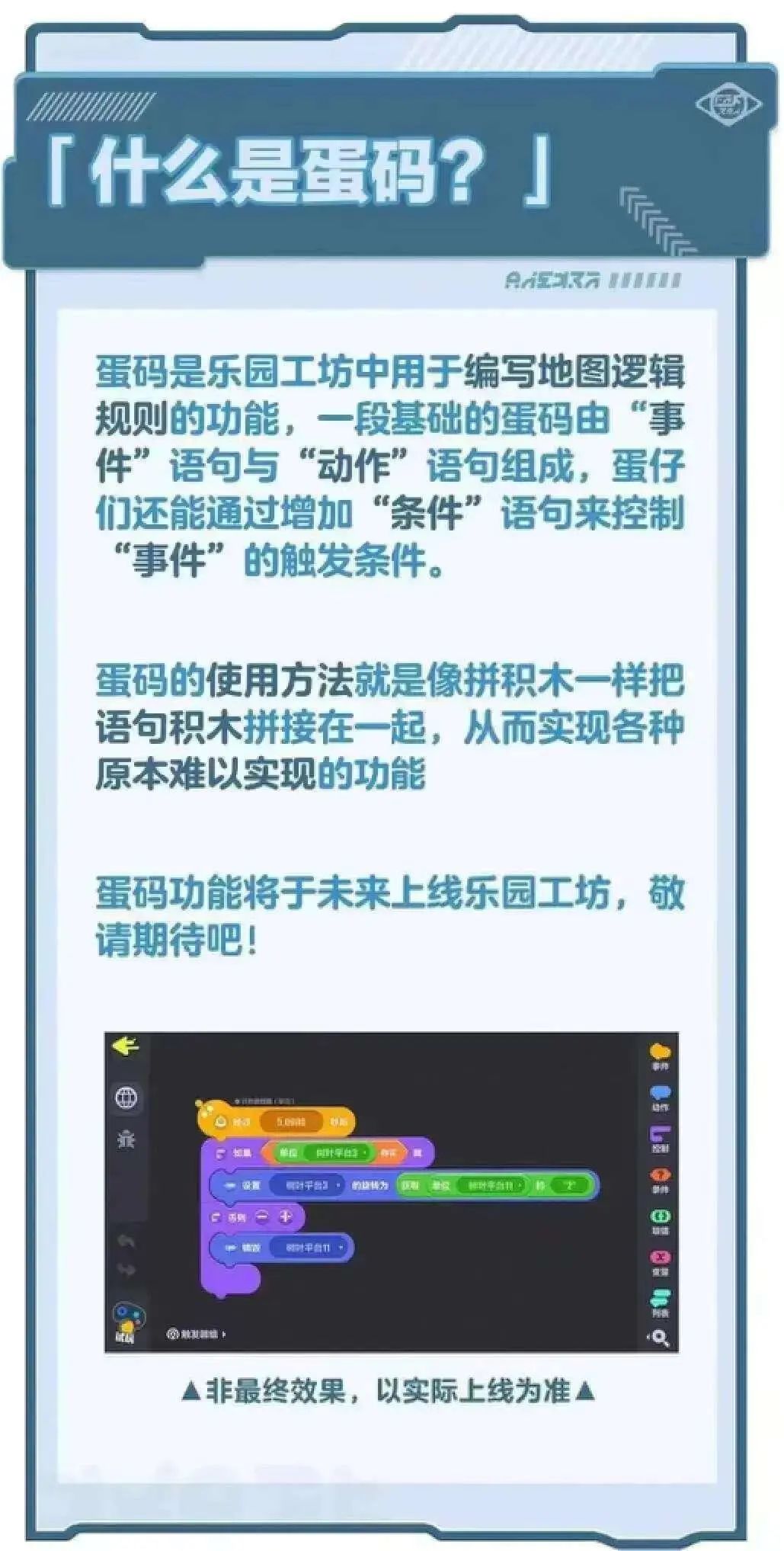 在上线之初,《蛋仔派对》就加入了名为“蛋仔工坊”的UGC编辑器,鼓励玩家自己动手制作游戏地图,并基于创作者的反馈持续优化编辑器,在增强功能的同时不断降低上手门槛。《蛋仔派对》编辑器也陆续加入AI一键地图换色、AI视频生成动作,以及类似于少儿编程的“蛋码”功能,可以让玩家用更少时间,创造出更加复杂、新颖的地图,打造一个蛋仔版“App Store”。