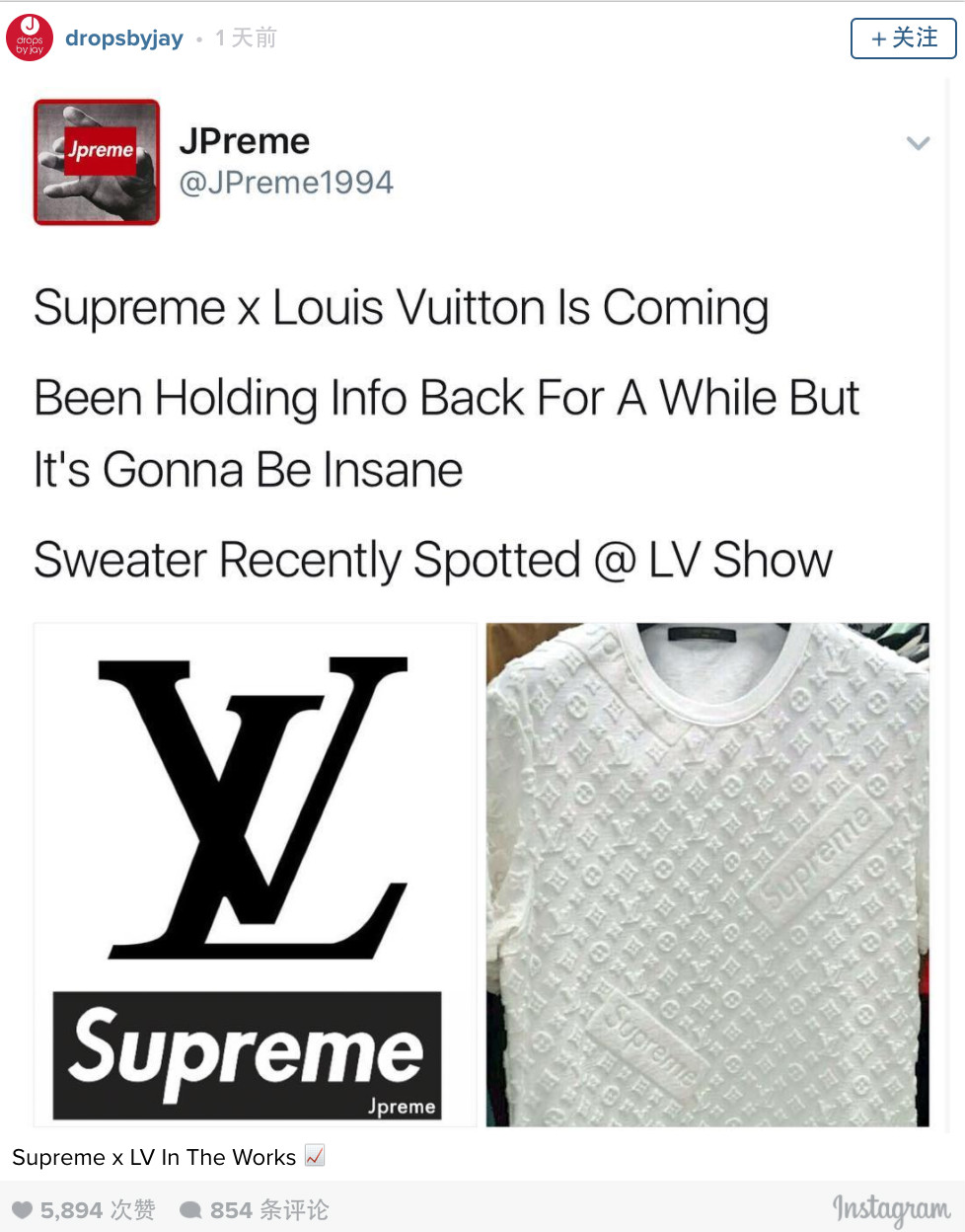 Instagram这些天的议论焦点逃不过这两家品牌的联手消息,就连实物图都能找到——以Louis Vuitton Monogram押花为底的白色毛衣,穿插着长方形“Supreme” logo。