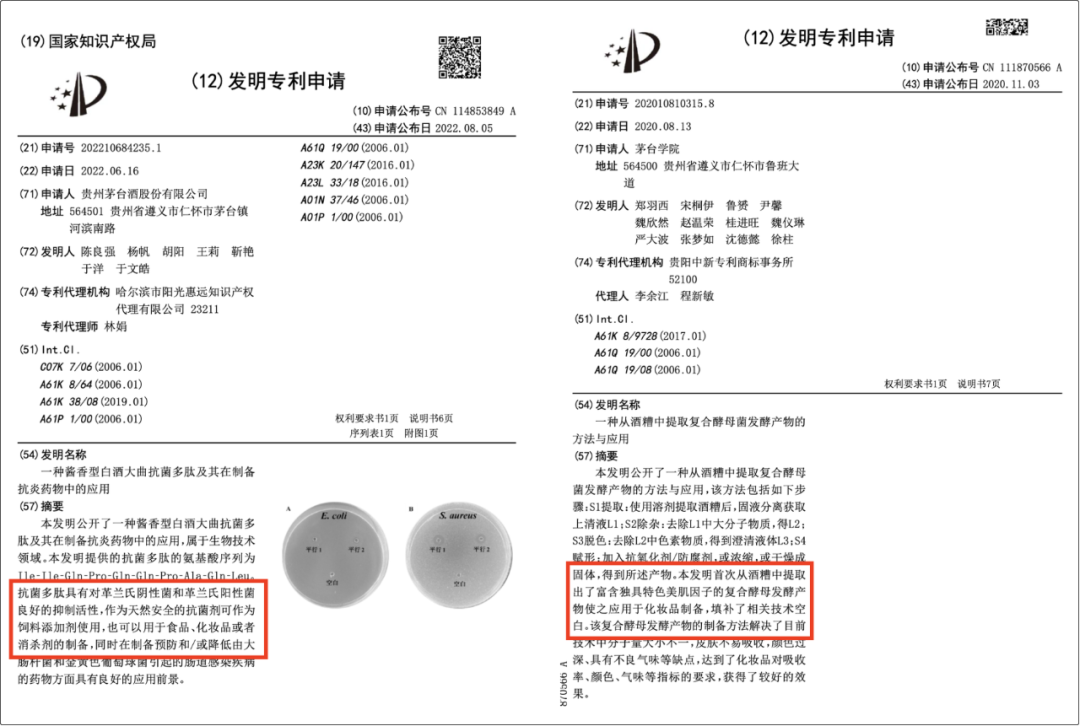 第一类是以茅台为代表,今年8月,贵州茅台酒股份有限公司申请的“一种酱香型白酒大曲抗菌多肽及其在制备抗炎药物中的应用”专利获授权在业内引起广泛关注,外界猜测这是茅台要进军化妆品界的预兆。