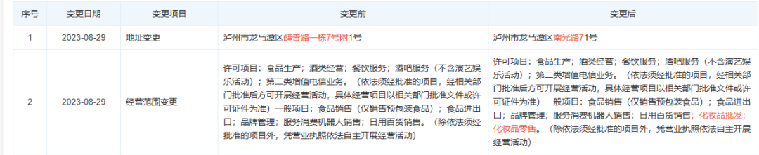 例如泸州老窖此次推出跨界新品的运营主体是泸州老窖新酒业有限公司,该公司是泸州老窖销售公司的全资子公司。天眼查显示,今年8月29日,泸州老窖新酒业有限公司的经营范围才增加了化妆品批发、化妆品零售。