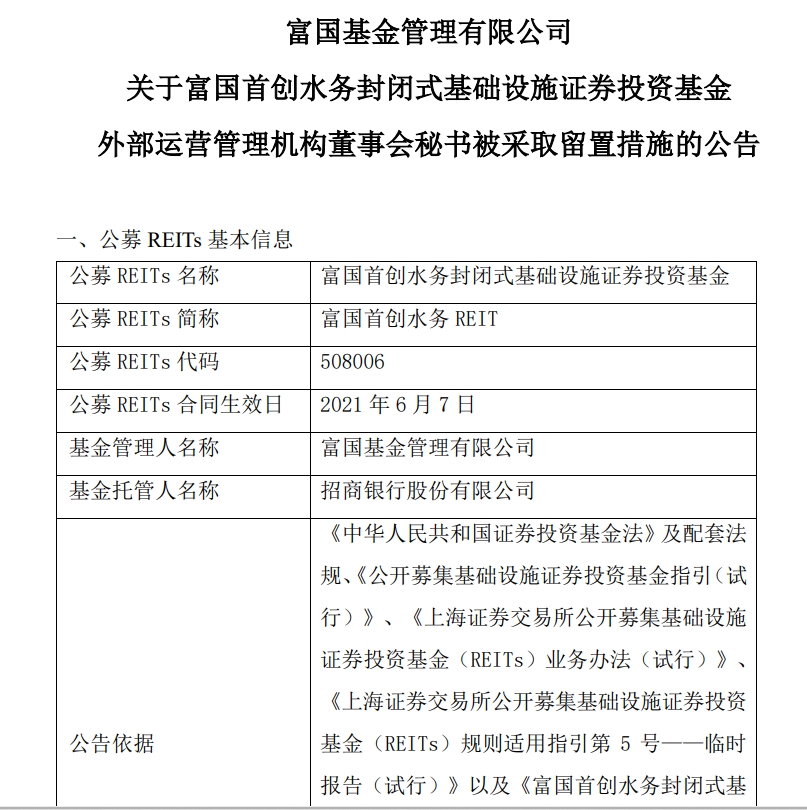 今日,富国基金发布公告,称外部运营管理机构—首创环保集团的董事会秘书兼总法律顾问邵丽女士被监管部门实施留置措施。