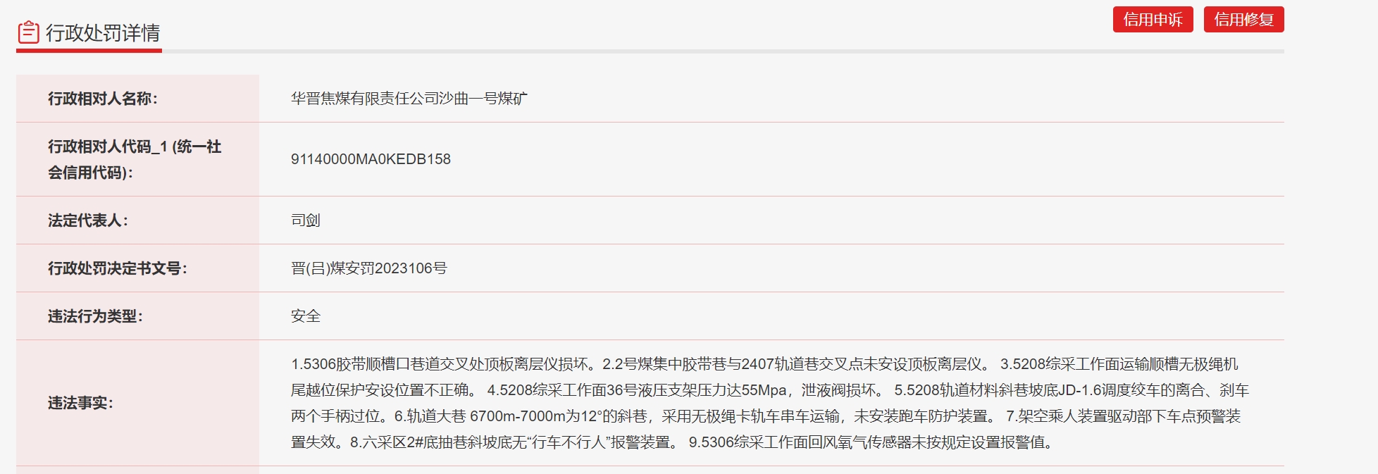 信用中国(山西吕梁)网站显示,今年12月5日,沙曲一矿因存在九项违反《安全生产法》的行为, 被吕梁市应急管理局处罚18万元。