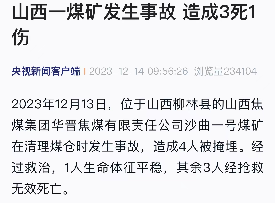 据央视新闻报道,12月13日,山西焦煤集团华晋焦煤有限责任公司沙曲一号煤矿(下称沙曲一矿)在清理煤仓时发生事故,造成4人被掩埋。经过救治,1人生命体征平稳,其余3人经抢救无效死亡。