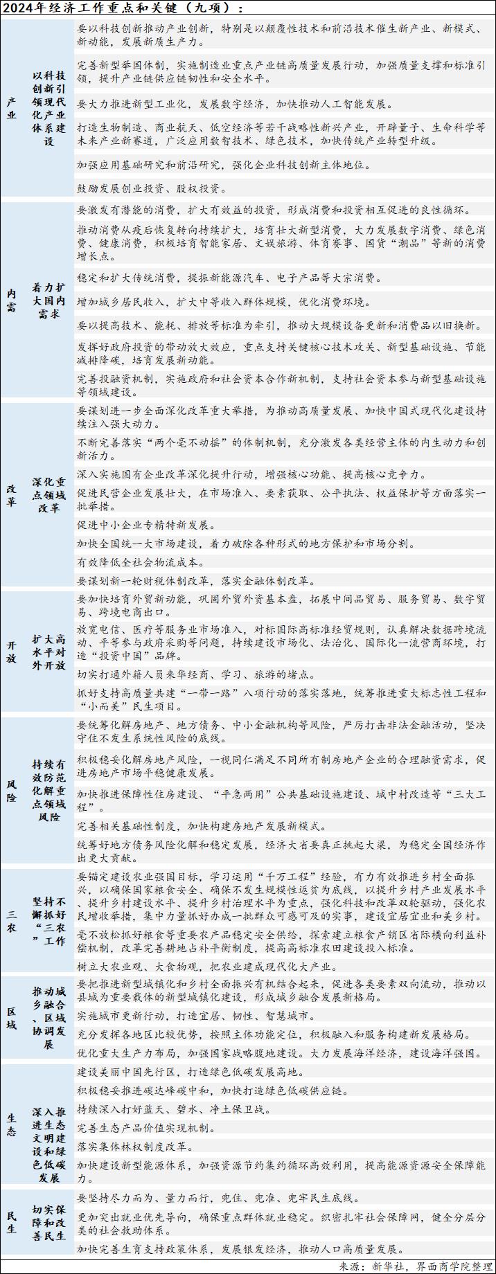 从会后通稿看,2024年的“进”可以说有两层含义:一层是经济运行,着眼于短期,中央要求“多出有利于稳预期、稳增长、稳就业的政策”,另一层是结构调整和方式转换,着眼于中长期,中央要求“在转方式、调结构、提质量、增效益上积极进取”。这两层都是2024年施策的主要对象,尤其是后者,更是作为重中之重,主要任务大多围绕这一层,以期达到“以进促稳”的效果。