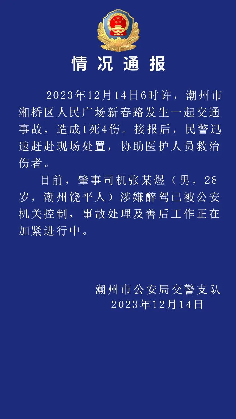 潮州交警通报,2023年12月14日6时许,潮州市湘桥区人民广场新春路发生一起交通事故,造成1死4伤。接报后,民警迅速赶赴现场处置,协助医护人员救治伤者。目前,肇事司机张某煜(男,28岁,潮州饶平人)涉嫌醉驾已被公安机关控制,事故处理及善后工作正在加紧进行中。