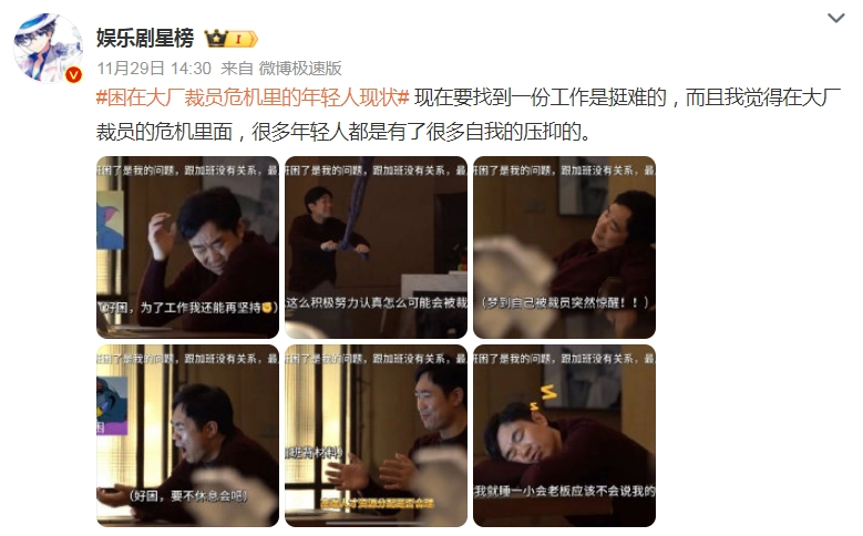 白客与大鹏的合作影片《年会不能停!》在影片上线前2个月发布了先导预告片,在进入11月23日后,都是影片的重点宣传期。电影宣传思路除常规参演主演宣传外,还加入了短视频常见的剧透式宣传与“关注现实”的新打法,在映前30天抛出3个微博关联话题#困在大厂裁员危机里的年轻人现状#、#打工人不想被裁只能先自裁#、#年会不能停 不想被裁只先自裁#。