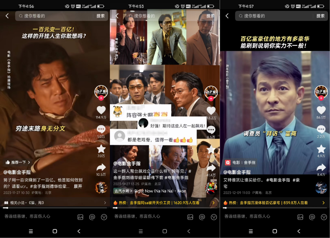 由英皇影视等10家公司出品及联合出品的《金手指》在宣传上则更侧重打出刘德华与梁朝伟合体这张王牌,同时也大量放出来了剪辑好的剧透视频来宣传电影由真实事件改编的故事,并以梁朝伟在电影中扮演的角色形象关联了#西格玛男人#这一更受男性青睐的人设话题。