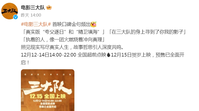 对于更具备爆款潜力的电影,项目在宣传方式上呈现出更大的图谋。由陈思诚监制,改编自网易人间工作室纪实文学作品《请转告局长,三大队任务完成了》的电影《三大队》,选择在元旦前15天上映,并在上映前12天开启了全国31城的超前点映。