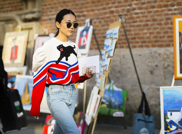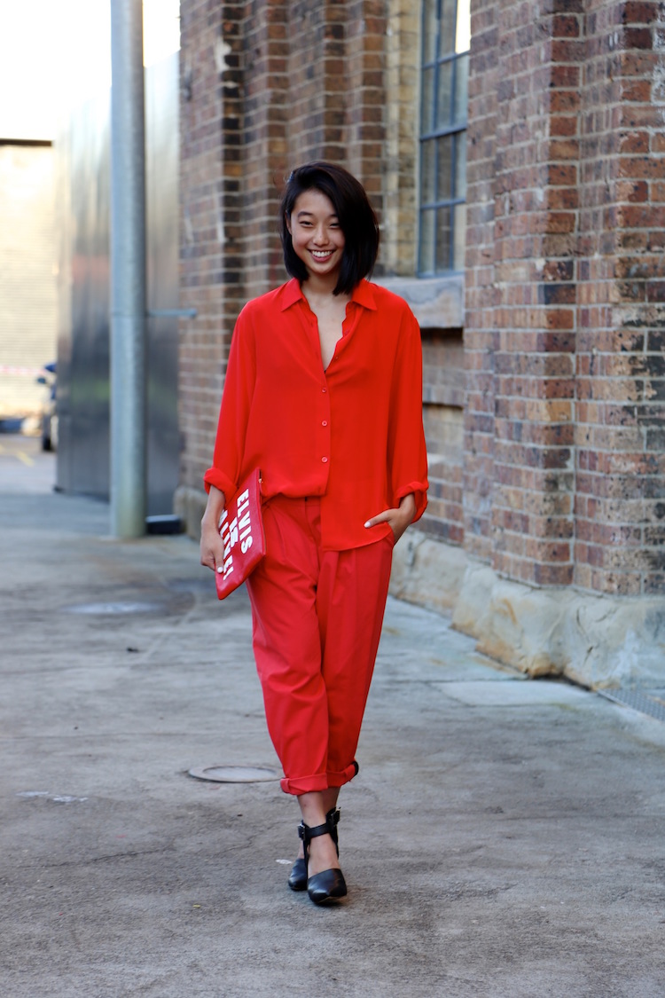 喜爱高调或者成为焦点的姑娘不妨就干脆利落地选择全身红的装扮,搭配红色或者黑色的鞋履都不错。在这上面的选择除了连衣裙也可以选择红色的裤装套装来进行搭配。亚裔博主Margret Zhang 与新加坡博主Yoyo Cao的红色裤装值得过年想帅气一点的姑娘借鉴。