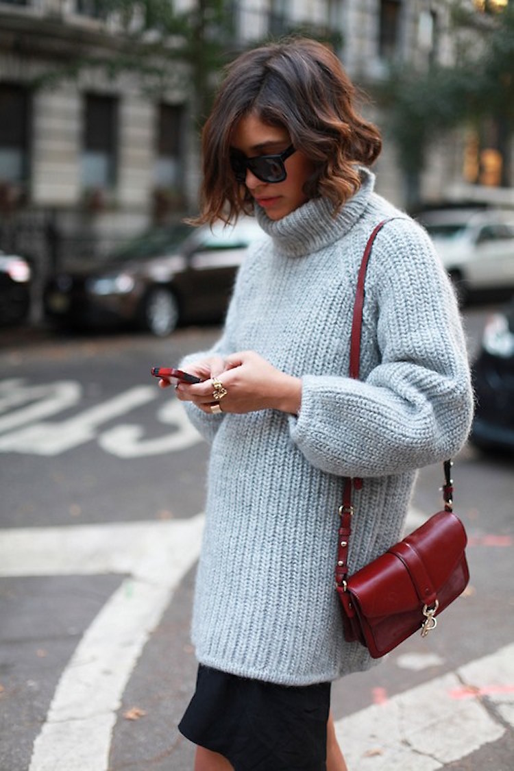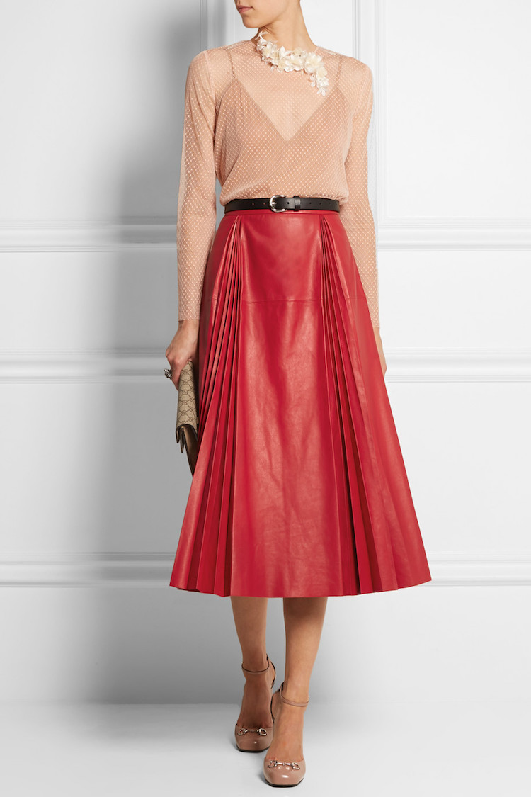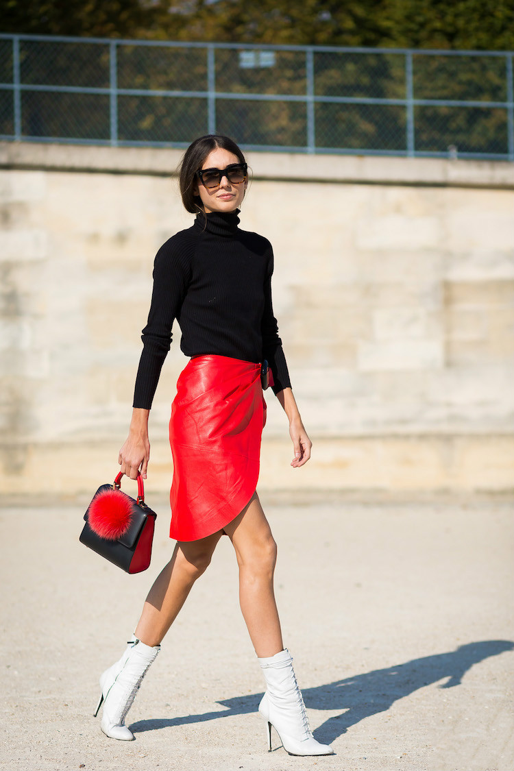 此外,不想太高调的姑娘,除了oversized的红色毛衣,不少红色的半裙款式也可以考虑购置。比如亮色的红色皮裙可以在上身选择搭配黑色的高领毛衣来避免红得过于耀眼,但是依旧保持喜庆感。