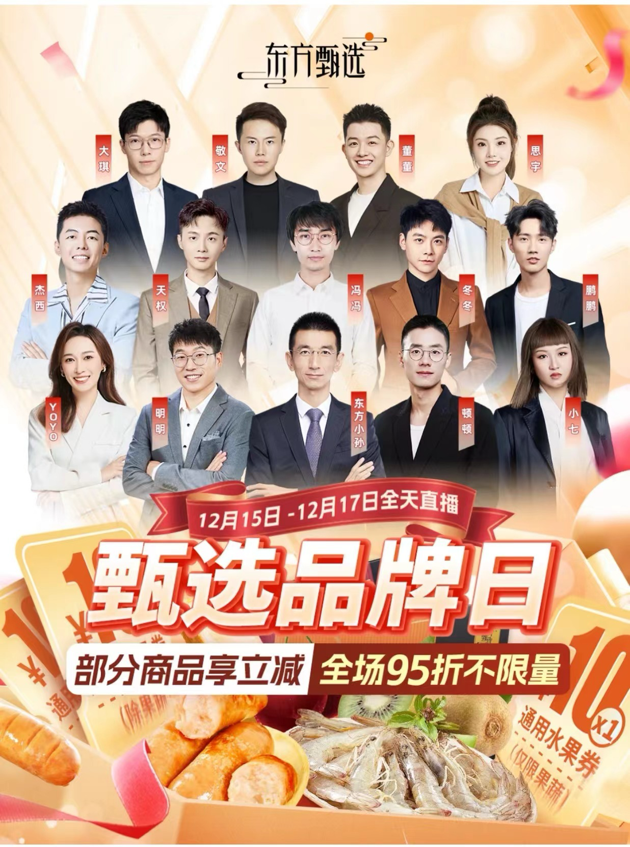 在东方甄选发布的一张12月15日-12月17日全天直播的“甄选品牌日”直播预告图中,亦未看到董宇辉的身影。