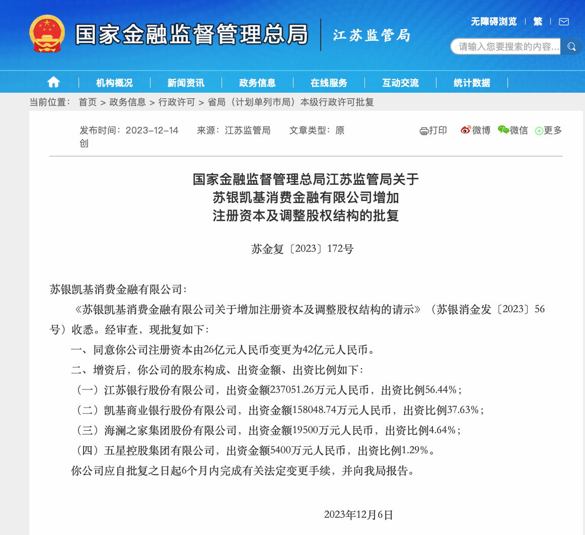 12月14日,国家金融监督管理总局官网显示,苏银凯基消费金融有限公司(简称“苏银凯基消金”)增加注册资本及调整股权结构获得批复。苏银凯基消金注册资本由26亿元人民币变更为42亿元人民币,增资幅度61.5%。